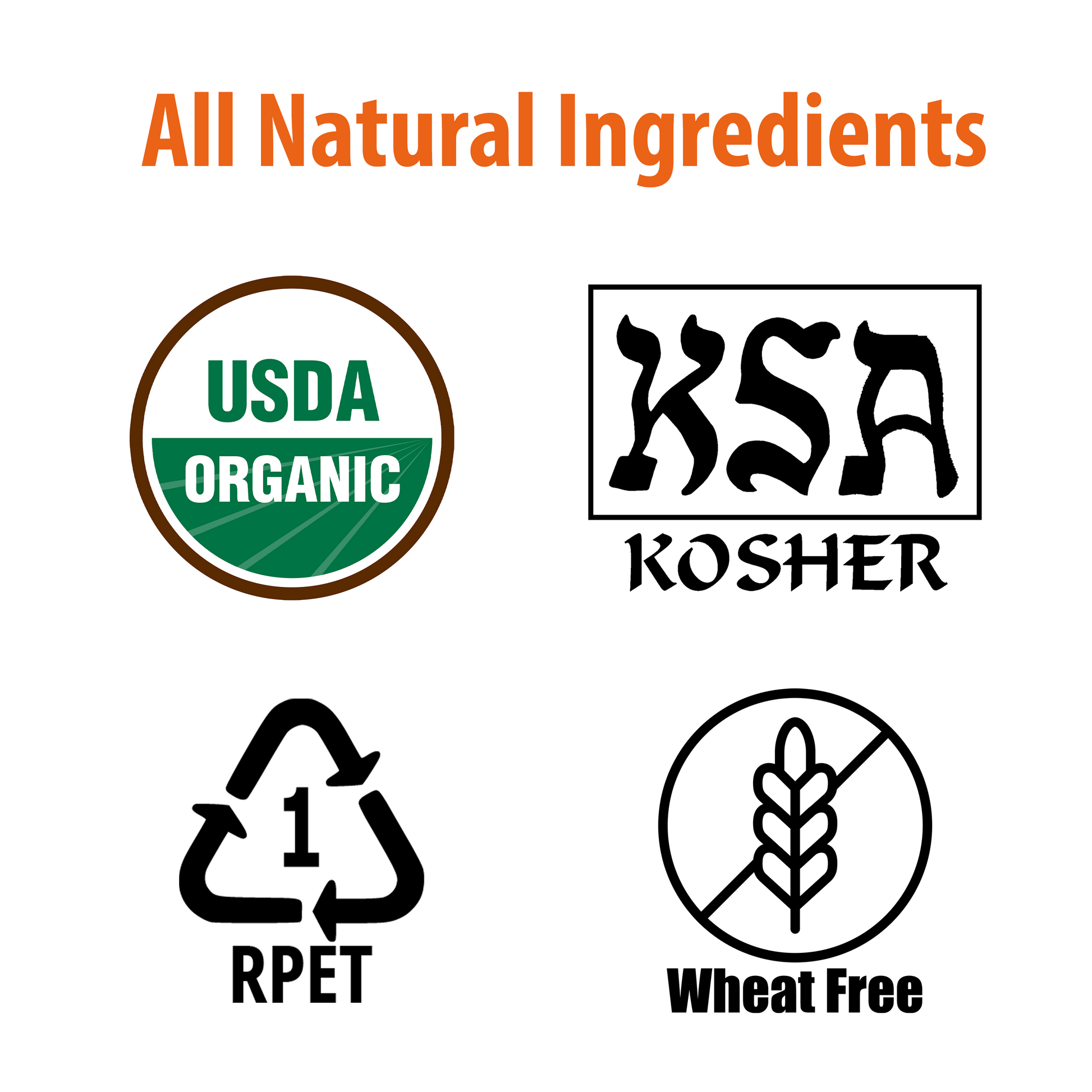 USDA Organic, KSA Kosher, Wheat Free, Non-GMO.